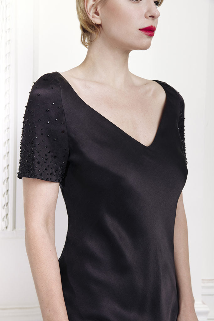 Cut on the bias long needle and thread hand embellished black satin silk dress.