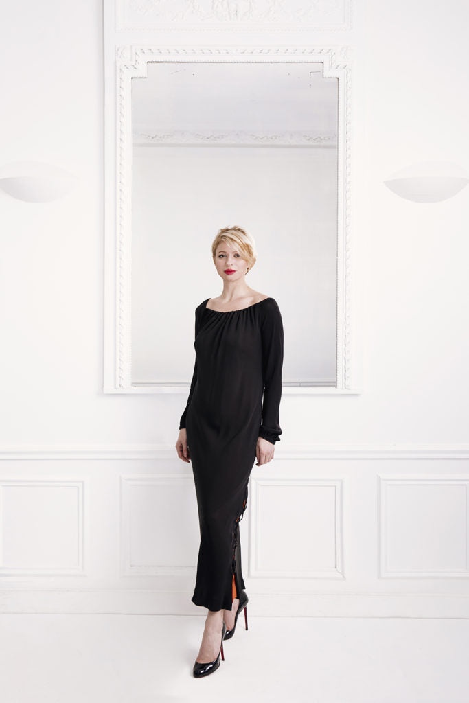 A precious cord embroidered underlines the neckline in black pearls and finished with two delicate black pearl tassels.
