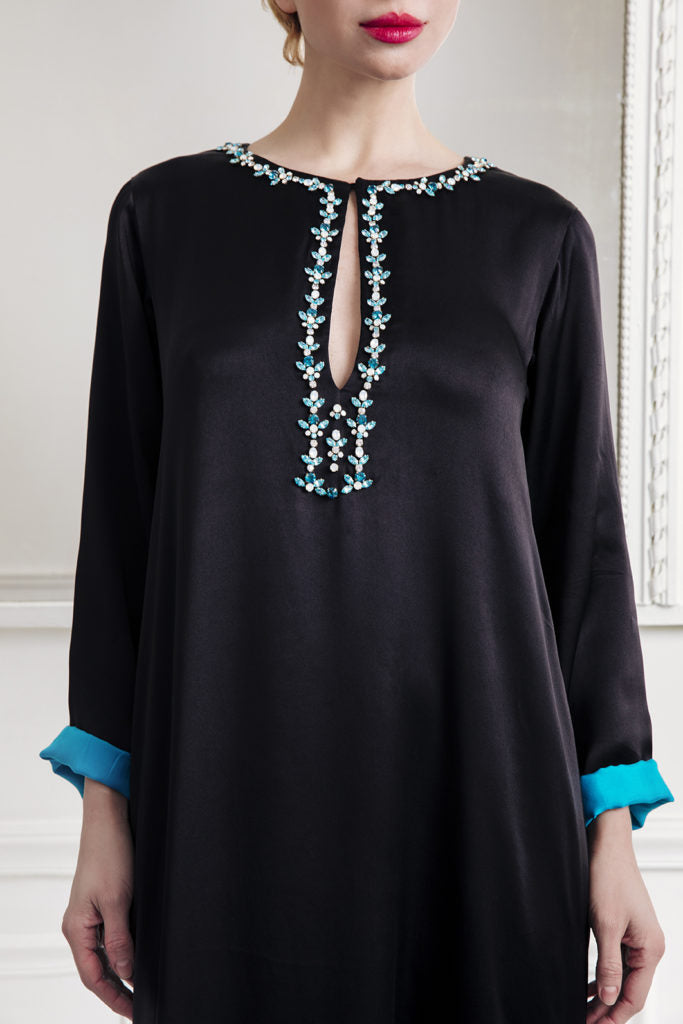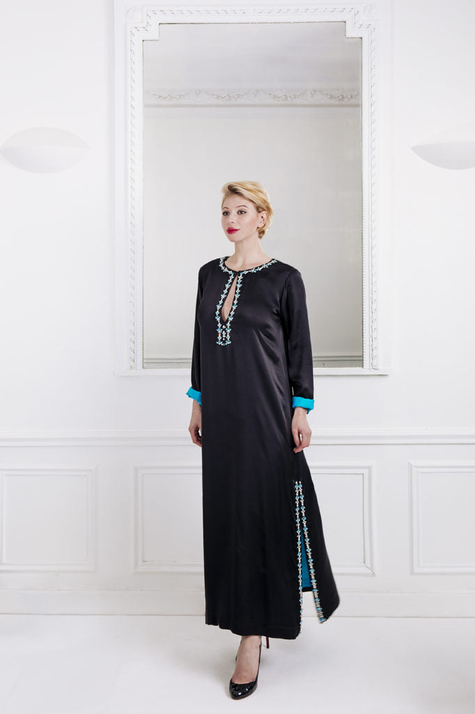 Deep black Crystal-embellished straight kaftan dress. Cut in a soft and very comfortable straight grain in satinsilk and lined with a contrasting bright and vivid turquoise tone.