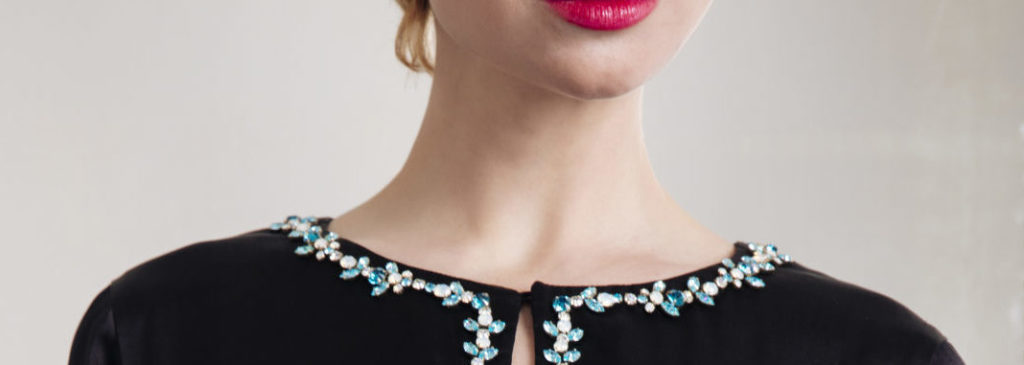 The open edge-to-edge teardrop collar is underlined by a beautiful Swarovski crystal embroidery in opal and turquoise colors, closed delicatly by a small button at the top.