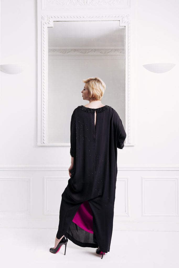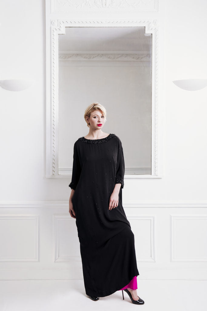 Black gown studded with small precious Swarovski crystals and delicate and elegant embrodery with black Swarovski beads for the neckline and cuffs.
