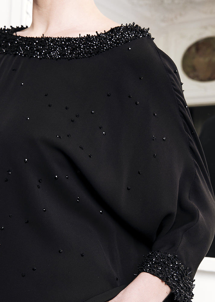 Black embellished dress with a soft and vague shape.