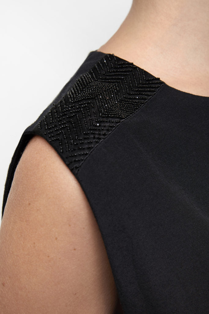 Black flax silk top embroidered on the shoulders with delicate chevron-shaped Galuchat beads and embellished by a black satin band at both sides of the top.