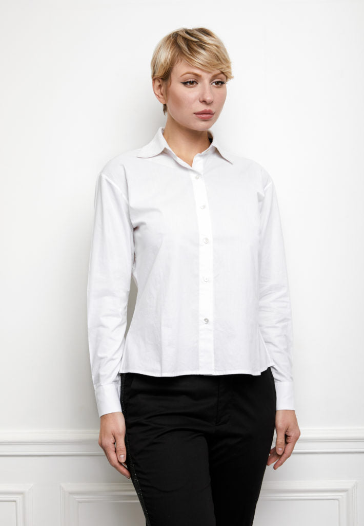 Iconic white cotton embroidered shirt. Embrodered collar and cuffs in white Galuchat beads.